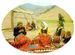 游牧居民 游牧民居住的毡房有自己的特点:毡房为雪白色,一般高3米多,直径3—4米不等,四周用条木80到120根,结成网状圆壁,与用椽木组成的伞形圆顶两部分组成毡房骨架,外面先围一圈芨芨草帘,草帘外围再围以白色厚毡,用行绳勒紧,壁上留有木框门,顶部职央留有圆形天窗,天窗一般直径约1米,留有一块方形活动毡盖,白天揭开,夜间或下雨时盖上,它有通风和吸收阳光的作用,毡房的中央和周围栽有大石或木桩,用坚固的粗毛绳把毡房系在上面,以防大风的袭击。毡房门多开向东南,以避北风。里面安装有木门,外面挂上毡制的帘子。室内有火和炉灶,进门右边为厨房,用精制的芨芨草帘装饰。右后角为父母及年幼的子女的铺位,右后角为儿子和媳妇的铺位,中间为客人铺位,左前方牧马具、狩猎用具。这种毡房,搬迁方便,易于短时间内搭成和拆迁,冬暖夏凉,并能抗风暴。